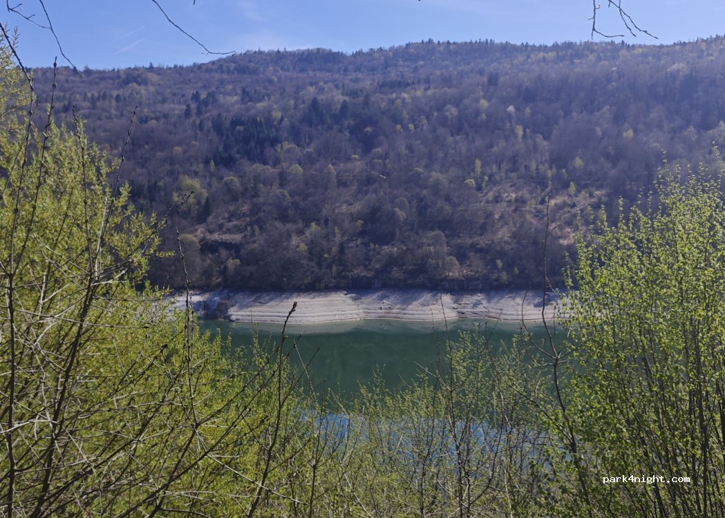 Roadside parking, super nice view of Lake Vouglans. Some wooden tables are present. Road very busy passing, and very quiet night. Only downside, some have not managed to put their garbage to the trash ...