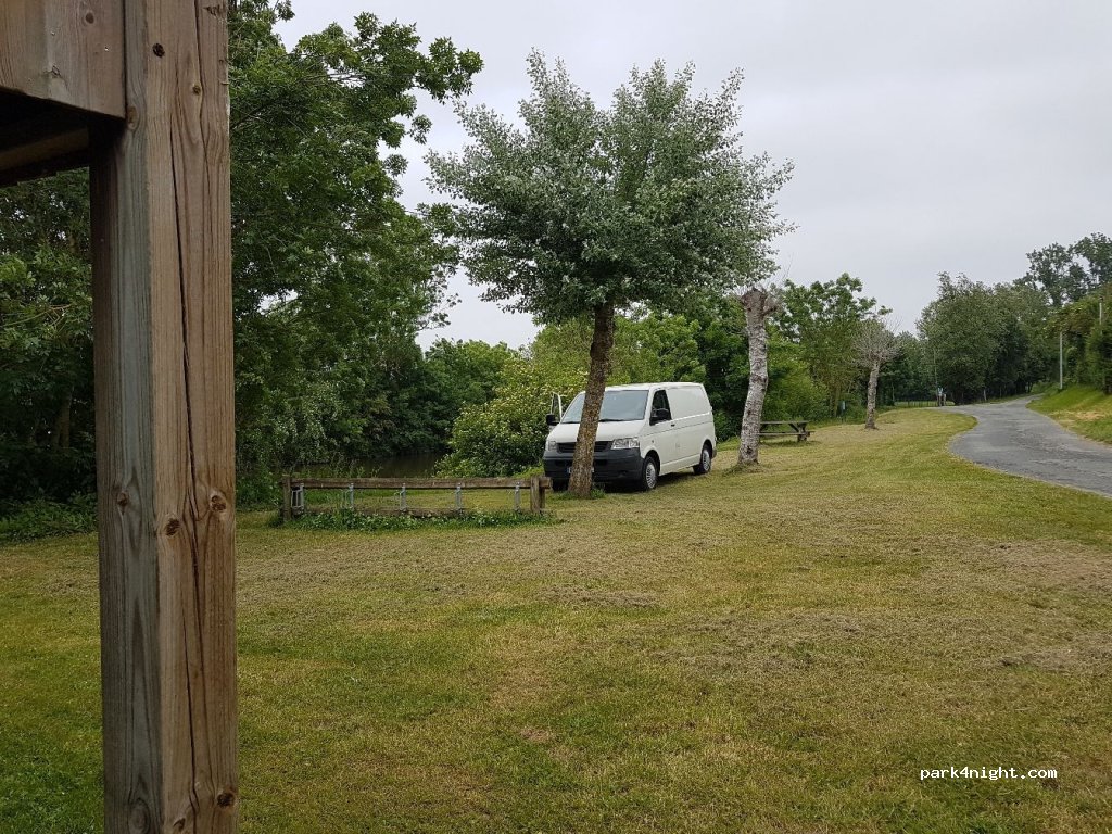 Bel endroit, je confirme qu'en continuant quelques km plus loin on trouve un grand parking en herbe juste avant la barre de la piste cyclable. Au bord de l'eau mais pas un seul moustique. S'il n'y avait pas eu une fiesta dans une maison basée au loin, nous aurions parfaitement dormi. (il y a une raisonnance car les maisons sont plus haut et la Vendée et son parking sont en contre-bas.