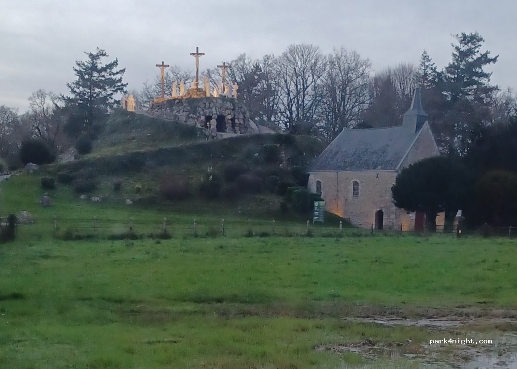 Grand parking gratuit, tables de pique-nique, toilettes et poubelles à dispos. Le Calvaire est magnifique, surtout la nuit illuminé et pendant le couché de soleil. Proche des sentiers pour se balader. Dormi 1 nuit dans notre van, pas de nuisance, super !