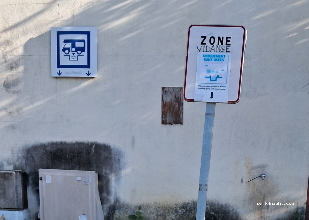 Eau et vidange possible, mais le parking est en travaux à ce jour, impossible d'y passer la nuit voire de se garer.