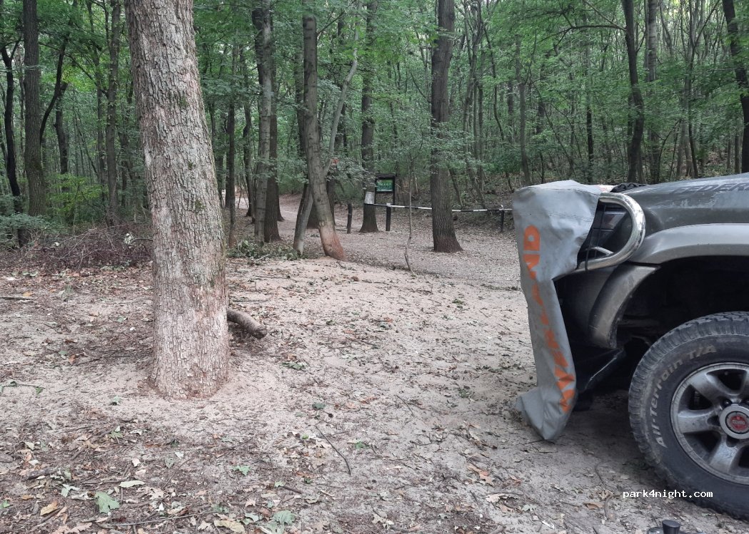 Parking gratuit en forêt avec aire de jeux, point d'eau et foyer. À environ 20 minutes en voiture du centre. Les promeneurs de chiens arrivent dès 6 h. Les randonneurs sont les bienvenus en journée, mais la nuit est calme.