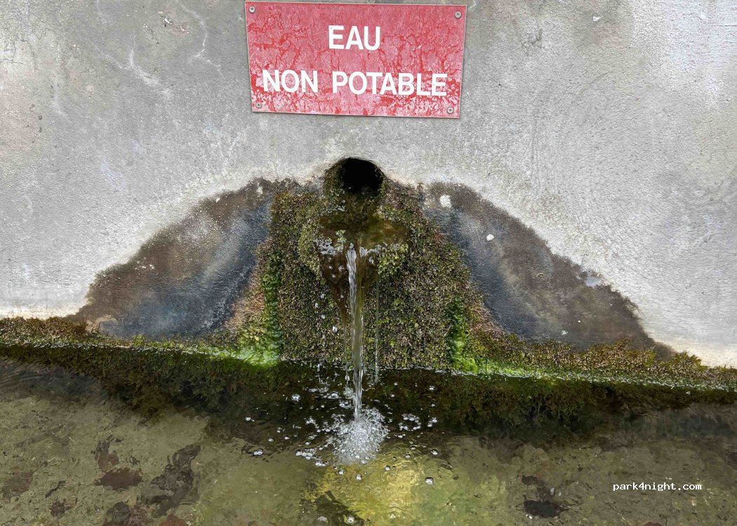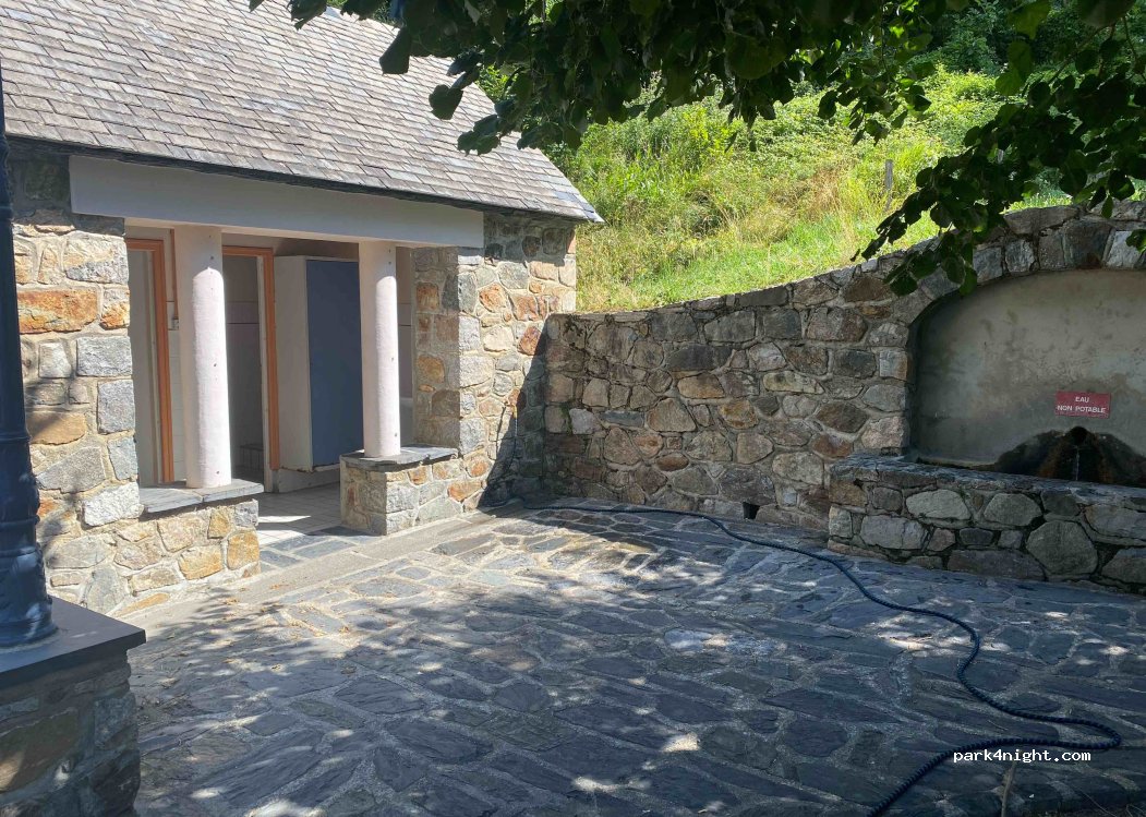 Parfait pour refaire le plein d’eau de la cuve et bouteille pour boire. Robinet standard avec pas mal de pression. Tuyau 10m nécessaire pour tranquille. Toilettes malheureusement à la turque mais ça peut justement permettre de vidanger la cassette WC si nécessaire proprement. Possibilité de se garer devant sans gêner le temps du remplissage