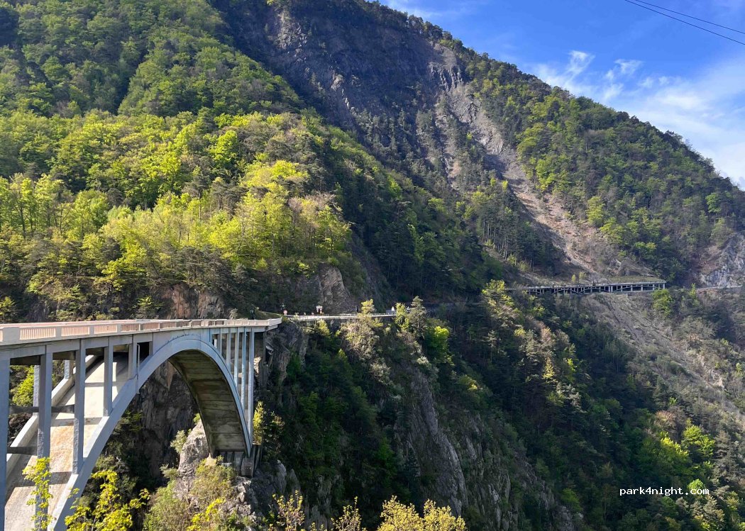 Large parking directly at the 103m high Pont de Ponsonnas viaduct. Straight footprint. In the back part picnic area.