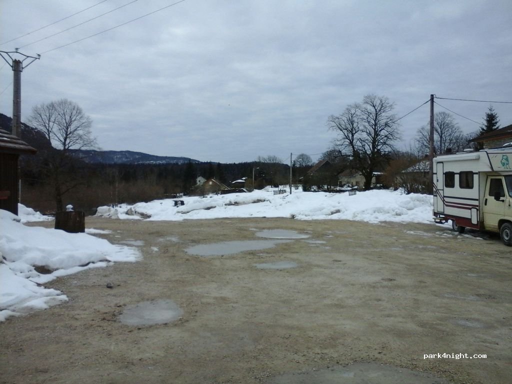 Parking sur gravier avec 8 emplacements. toilettes et eau â disposition, départ de la balade à la cascade du Hérisson et Boisserie, fromagerie et restaurant juste à côté, très calme et bucolique. Route à côté peu passante la nuit.