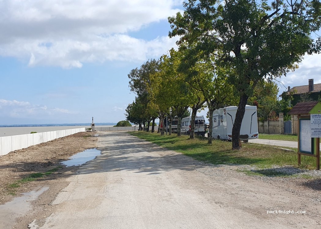 2 € la nuit (comment payer ?). L’accès sur le parking destiné aux camping-cars est difficile à cause de la boue. Grand parking libre à côté. Très tranquille sur les bords de la Gironde, passage de bateau fréquent.