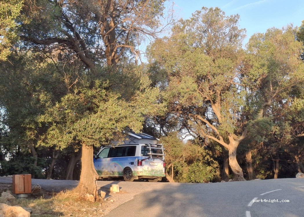 Très bel endroit, à 20m de la Petite Batterie, avec vue magnifique. Tables de pique-nique sur la batterie. Poubelles. J’ai été réveillée à minuit et à 3h du matin par une moto et une voiture et des gens qui parlaient. Attention, légèrement en pente et peu adapté aux camping-cars. Un peu d’ombre. 4G Free OK.