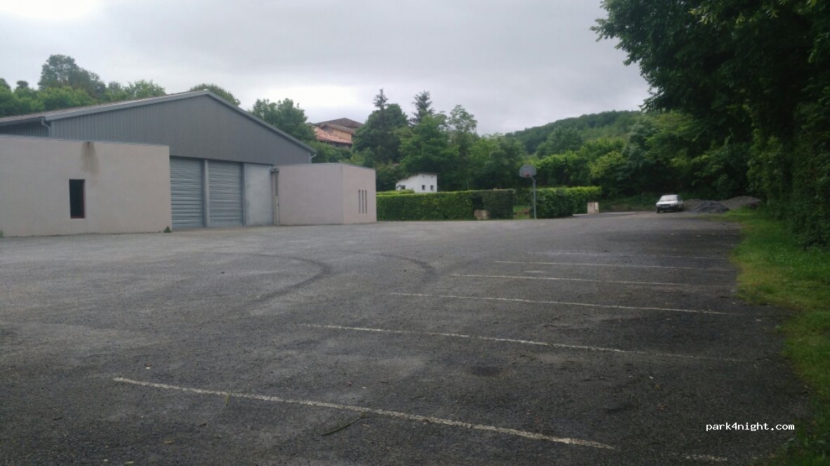 grand parking de la salle des fêtes, en bord de champ et forêt. très calme. on est seul ce soir