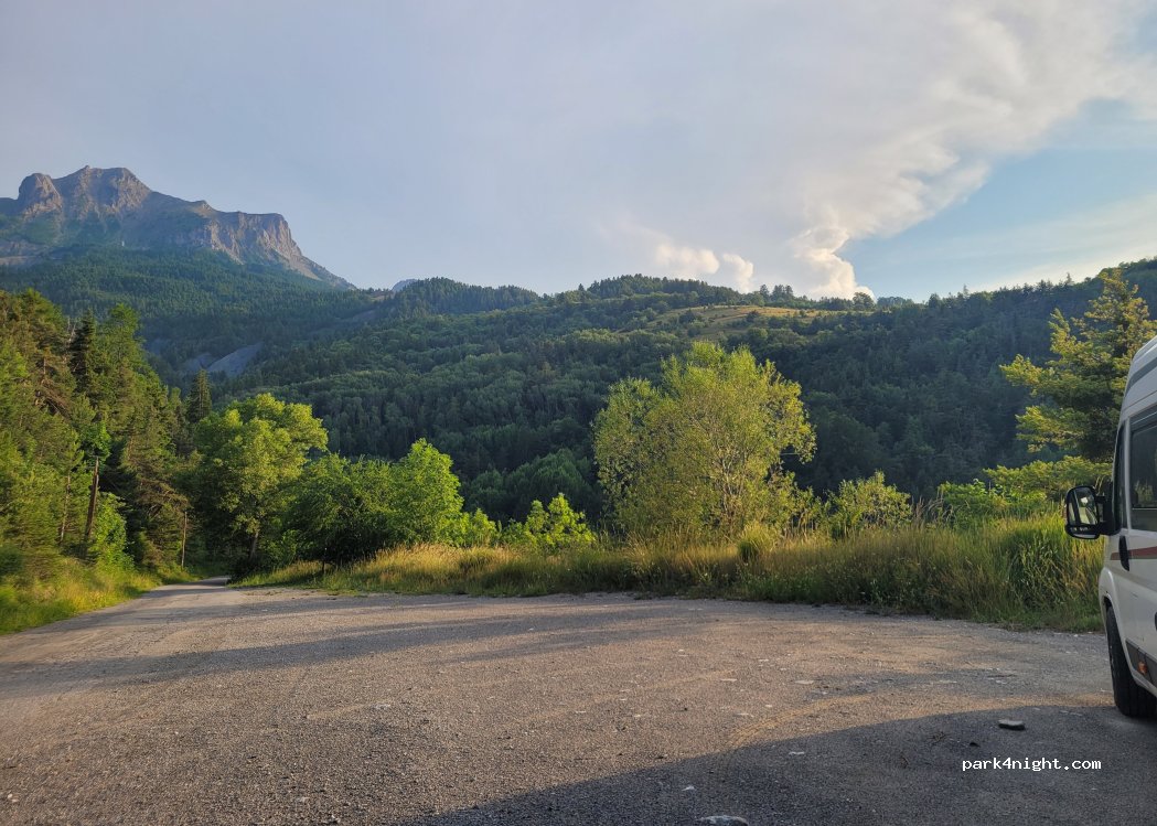 Parking at the edge of a road with little traffic, 2 minutes walk from the village, no service but garbage 200 m. Parking is flat on one side and offers a superb view of the mountains. In total calm early June.