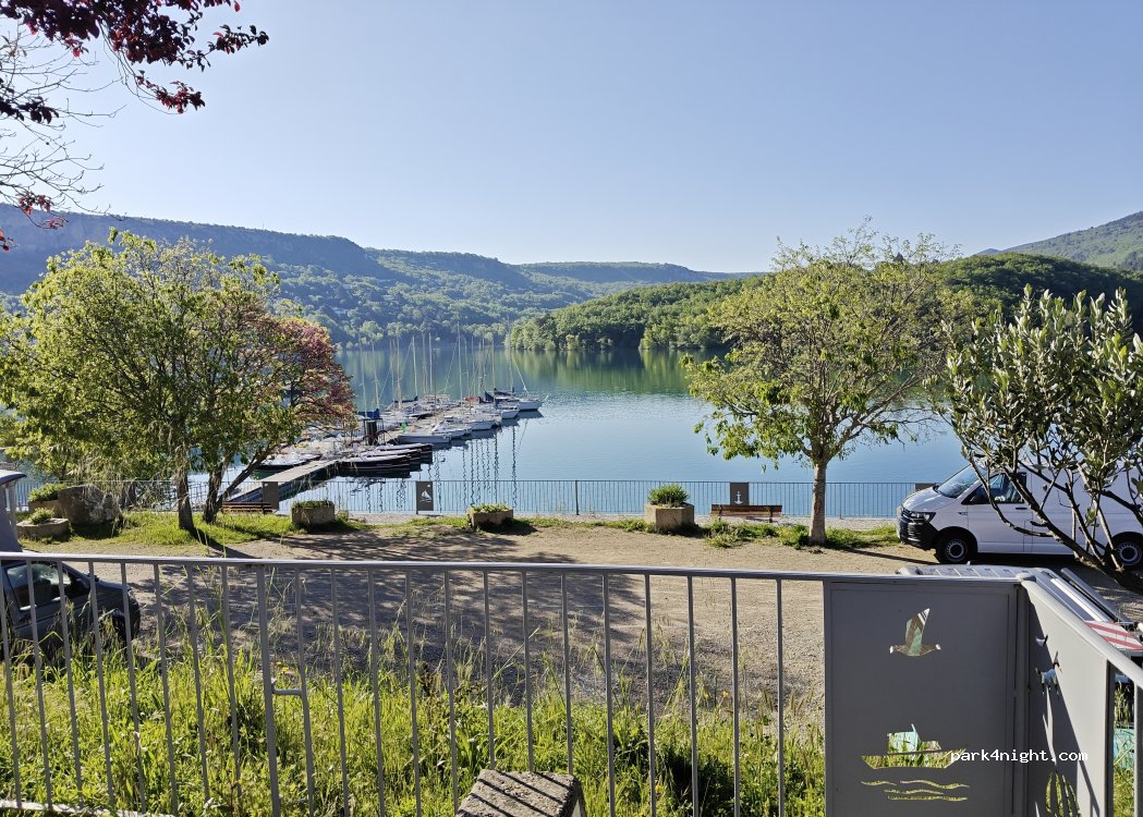 Parking gratuit sur la place du village immédiatement au bord du lac. Toilettes publiques. Pas de barre de hauteur sur le parking asphalté en haut. Belle rive du lac, commerces, restaurants, location de pédalo et canot. Les bornes électriques sont réservées aux marchés.