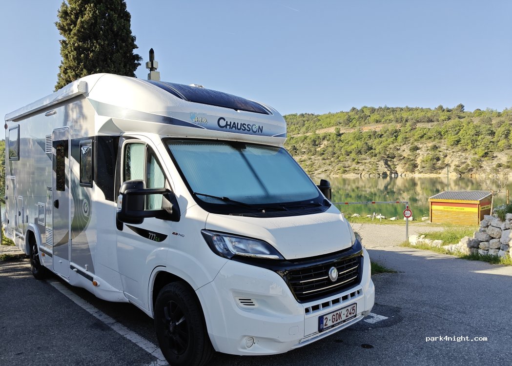 Superbe endroit au pied du village de Bauduen. Le parking comporte deux parties : une non limitée en hauteur et une autre limitée à 2m10, au plus près du lac. Les toilettes sont en travaux.