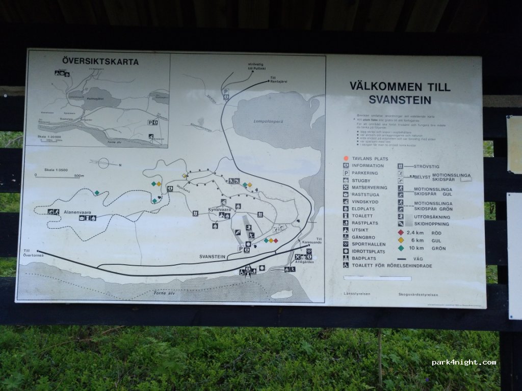 Wirklich empfehlenswerter Rast- oder Übernachtungsplatz direkt am Torne älv, dem Grenzfluss zwischen Schweden und Finnland. Neben der Badestelle, der Grill- und Sitzgelegenheit bietet sich auch der Berg zu einer Wanderung an. Svanstein ist eigentlich ein Wintersportort. Auf dem Parkplatz befindet sich eine gute Karte, die verschiedene Touren anbietet. Vom Ufer oder noch besser vom Berg aus hat man einen fantastischen Blick auf Finnland. Wir sind hier am Nachmittag zufällig vorbei gekommen und spontan über Nacht geblieben.