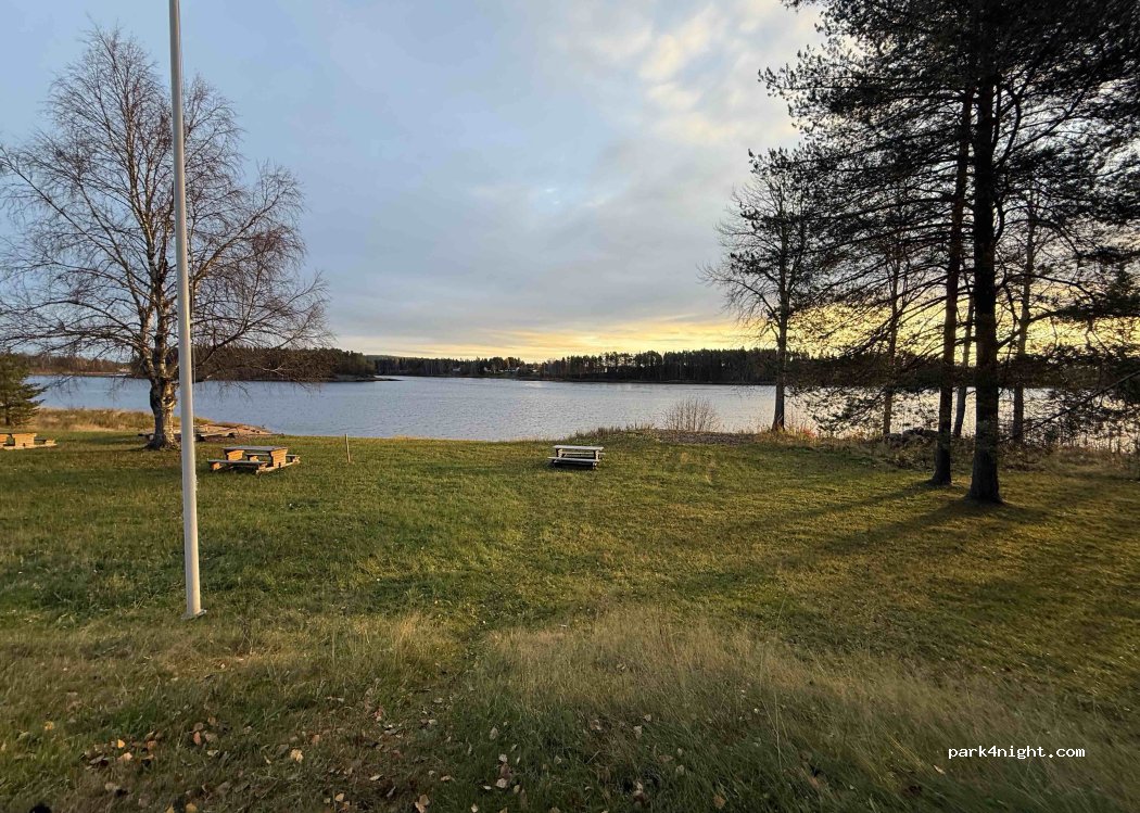 Zone de gravier plat et de niveau juste à côté de la rivière qui divisait la Suède et la Finlande. Toilettes à compost donc pas de vidange de cassette. Cependant, la porte des toilettes est fermée pour le moment. Table de pique-nique au bord de la rivière et petite plage de sable.