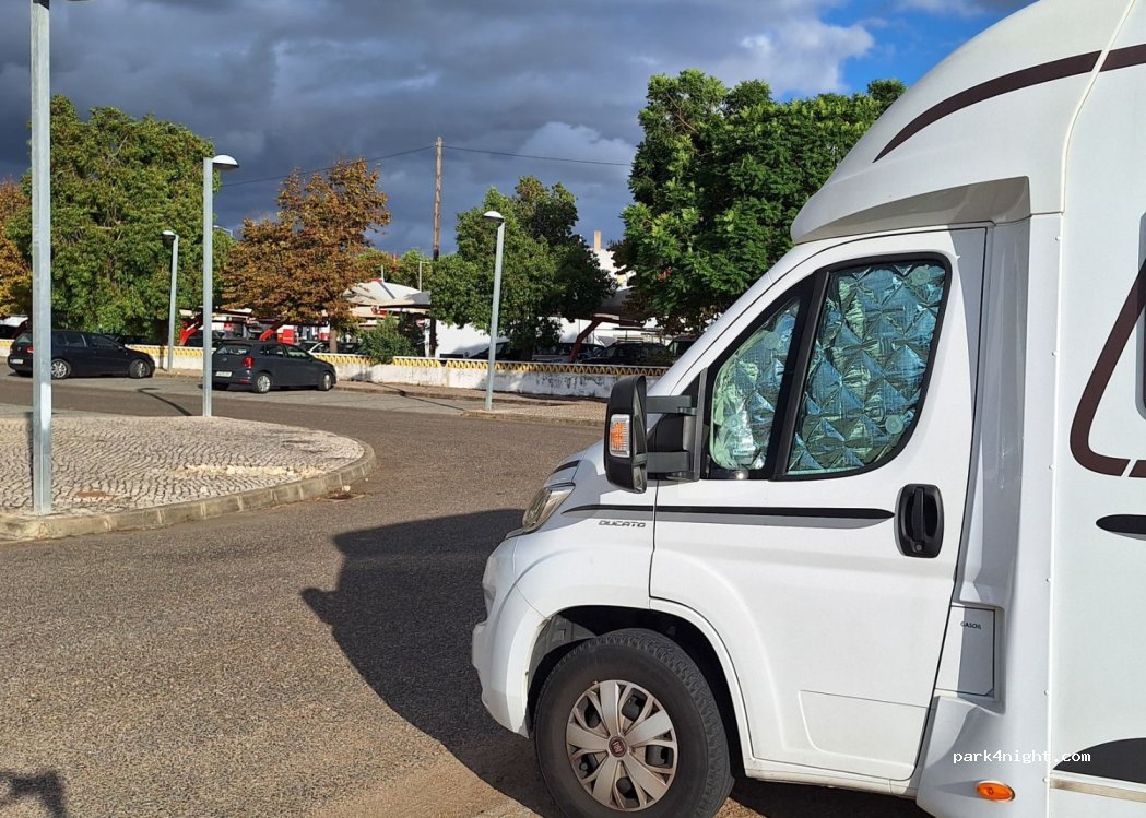 Il s agit du parking de la piscine. Apres renseignements pris auprès d intermarche et de locaux, aucun problème pour y dormir. Ideal pour véhicule de 6 m. Nuit calme jusqu'à 6 h. On entend le bruit des compresseurs des chambres froides du supermarché toute la nuit. Chiens qui aboient mais c est normal au portugal. Pas de services. A pied : 5 mn du marché couvert et des bars, 10 mn du centre.