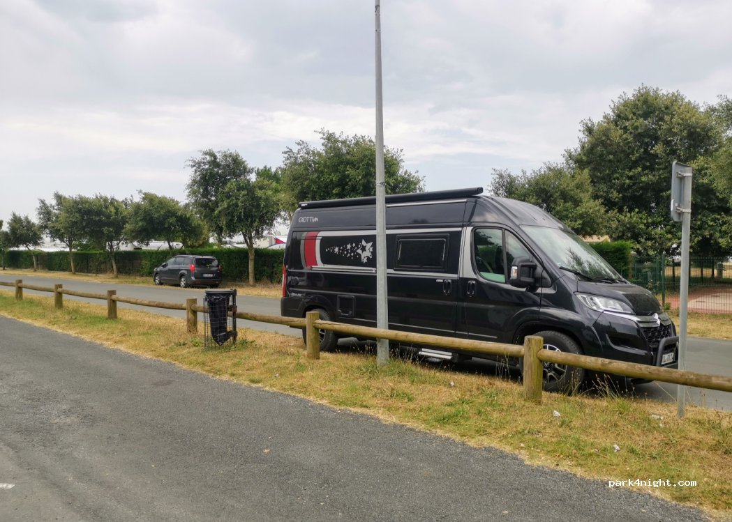 Aire façon parking en épi, places longues et larges, eau à priori dispo sans utiliser la borne. 8,3€ pour 24h max sinon FPS 17€ comme un parking standard (il faut rentrer l'immatriculation du véhicule) en face du camping , route calme à partir de 22h, 20 mn à pied du centre de Fouras par la côte.