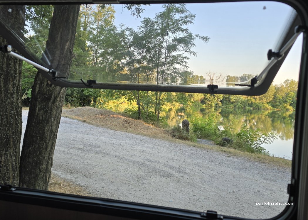 endroit plutot calme le soir après minuit, de nombreuses places a l'ombre pour les cc, une base nautique juste a coté et une guiguette, c'est tres joli, attention cependant beaucoup de voitures en journée ce qui peut bloquer le cc pour un départ.