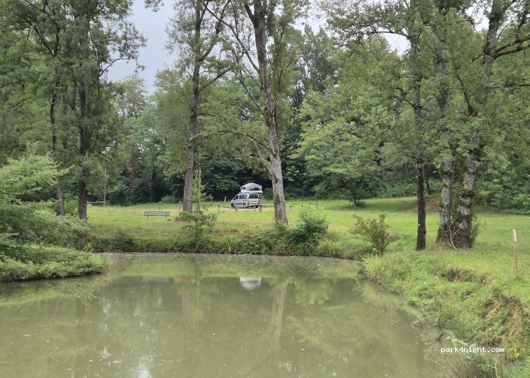 bel emplacement nature avec étang 2 min du centre village, bien laisser le cimetière à droite...au calme, un peu de moustiques, nuit très agréable, les gazouillis des oiseaux aux réveil et quelques promeneurs endroit propre avec autour de l’étang 5 poubelles