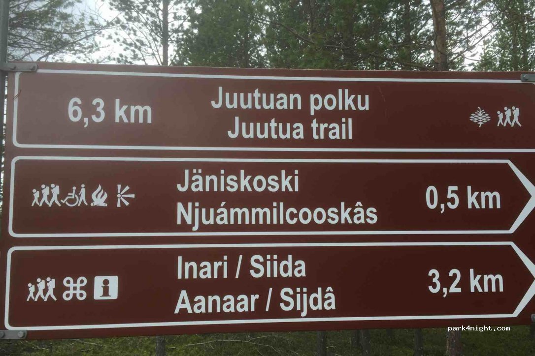 Guter Parkplatz für eine wunderschöne Wanderung. Übernachtung ist leider verboten. Wenn man im Uhrzeigersinn läuft, gibt es einen kleinen, versteckten, aber sehr romantischen Weg ein Stück am Fluss entlang. Der Einstieg ist direkt am südlichen Ende der Brücke in Inari, noch vor dem Sajos.