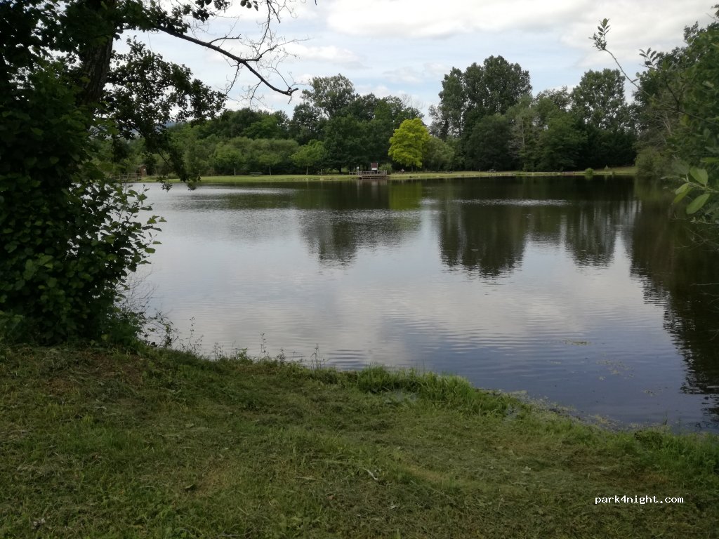 Étang tranquille avec parking sans limite de hauteur. Attention l’entrée avec parking et aire de pic nique se fait par un accès sur la route principale.
