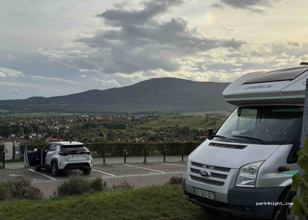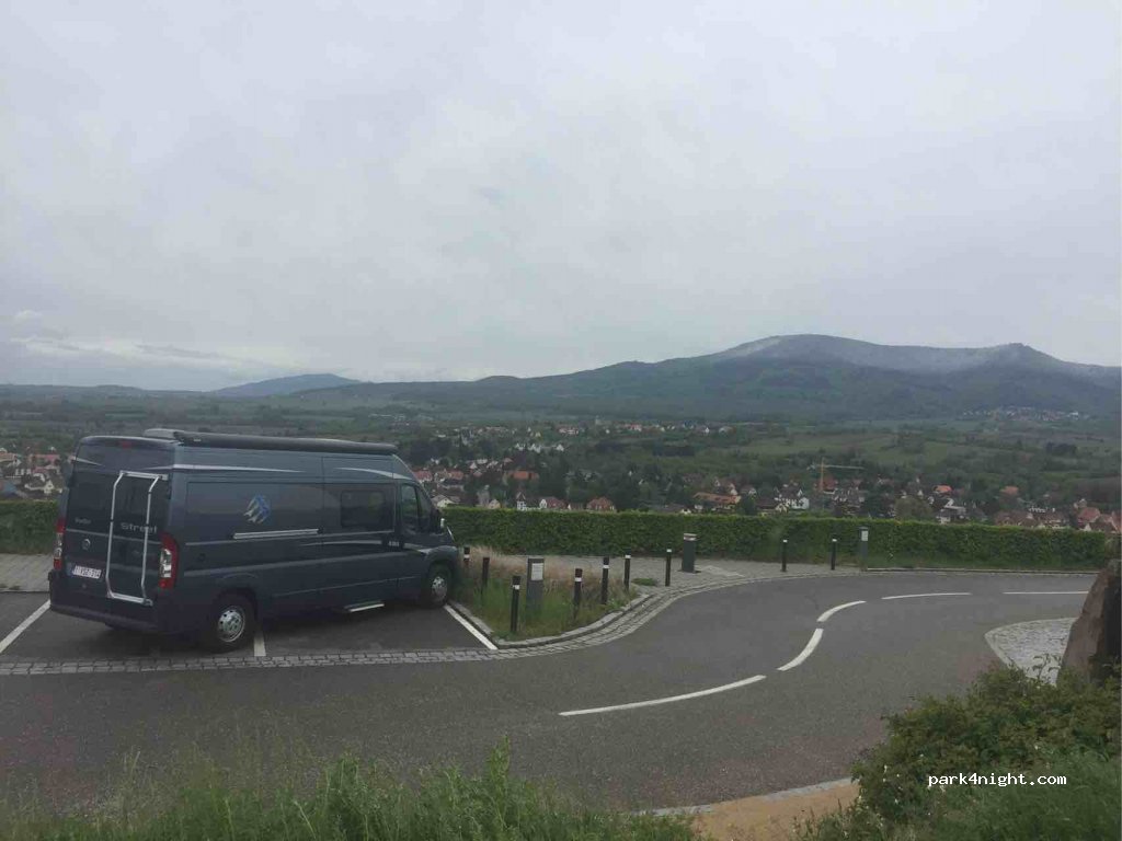 Bravo pour ce Spot…très belle vue sur la ville d’Obernai et son centre historique…Camping-Car Maximum 6m00…(à 100m possibilité de garer jusqu’à 9m00…)…très bonne connexion téléphone et télévision…ai passé une nuit calme sans aucun problème de bruit, plus de passage après 20h00…de belles balades à faire dans les vignes…(attention du vent, y étais en septembre…)