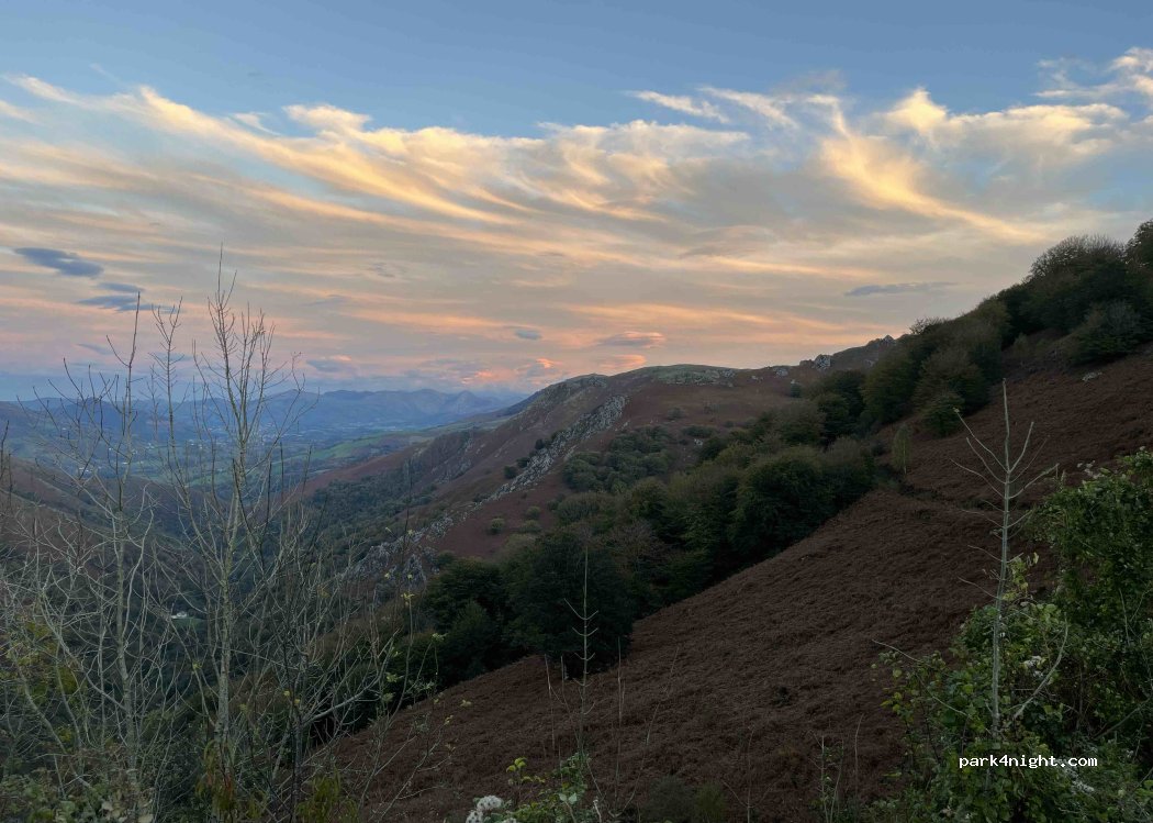 Vue superbe. Seuls pour passer la nuit sur le parking du 11 au 12 août. Départ de randonnée (chemin au fond du parking au sud) vers le site mégalithique d'Elorta. Il faut compter une bonne heure de marche dans les sous bois pour arriver sur le site au milieu des chevaux et moutons en liberté à la frontière Espagnole. Avec les vautours dans le ciel. Magnifique.