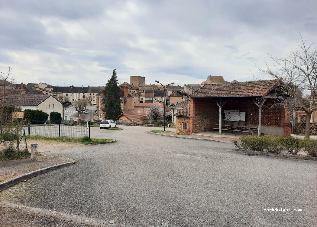 Nous nous y sommes arrêter pour faire le plein d’eau. Un abri pique nique et des sanitaires propres. Les emplacement sur le dessus sont plats. Idéal pour visiter ce jolie village classé parmi les plus beaux villages de France. Nous avons dormi à l’extérieur du village sur le terrain de foot.
