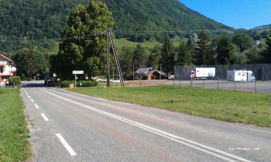 Petit parking bien sympa, plat, bord de rivière avec vue sur les montagnes. Près d'une route qui avait l'air calme (Nous n'avons pas dormi).Aire de vidange située à quelques mètres après le Pont (Jeton à acheter au restaurant en face). Très propre. Le village est petit mais avec une particularité, balcons à tavalans et excellente fromagerie.Nous avons adoré ce lieu. Merci à cette petite commune!