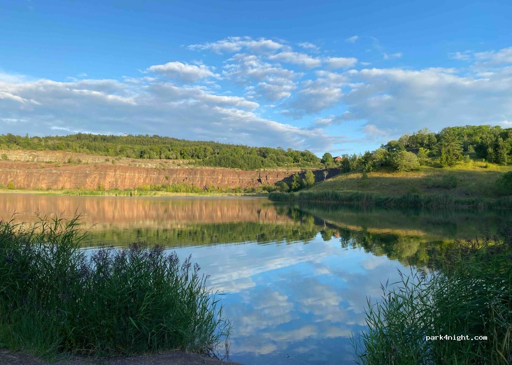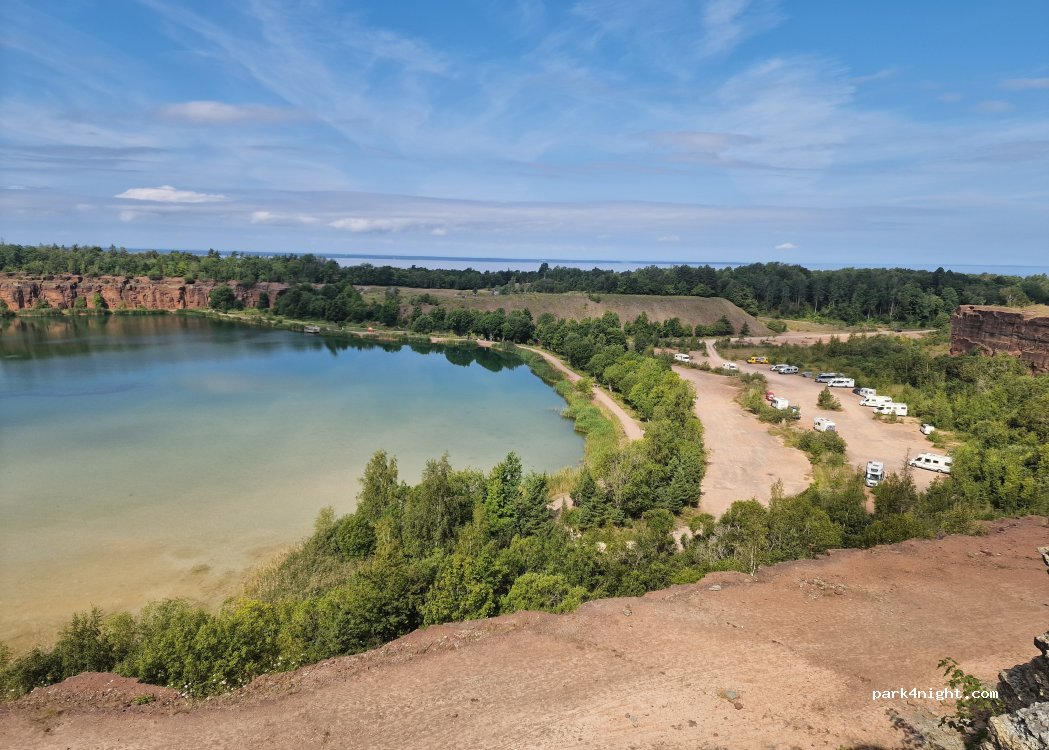 trevlig och lite ovanligt att stå i ett stenbrott. uppe vid sjön kan man fiska om man köper fiskekort grillplatser och bord vid sjön går nog att bada också. flera leder att vandra kan rekommenderas gott om plats för stora fordon