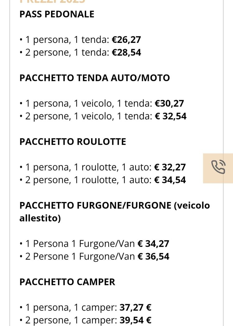 Da prenotare in anticipo. Forse abbiamo fatto pietà alla proprietaria, che ci ha fatto entrare e ci ha dato una piazzola con elettricità nonostante dicesse che fosse pieno. Una volta dentro in realtà abbiamo visto un sacco di piazzole vuote… Prezzo: €42 euro (IN CONTANTI) per una notte per due persone (forse un po’ eccessivo per quello che offre). Bagni senza acqua calda. Servizi camper ok