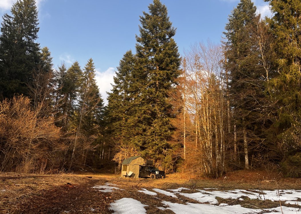 Super endroit proche de la route mais au calme, en bord de forêt, plutôt propre 10min à pied du lac !