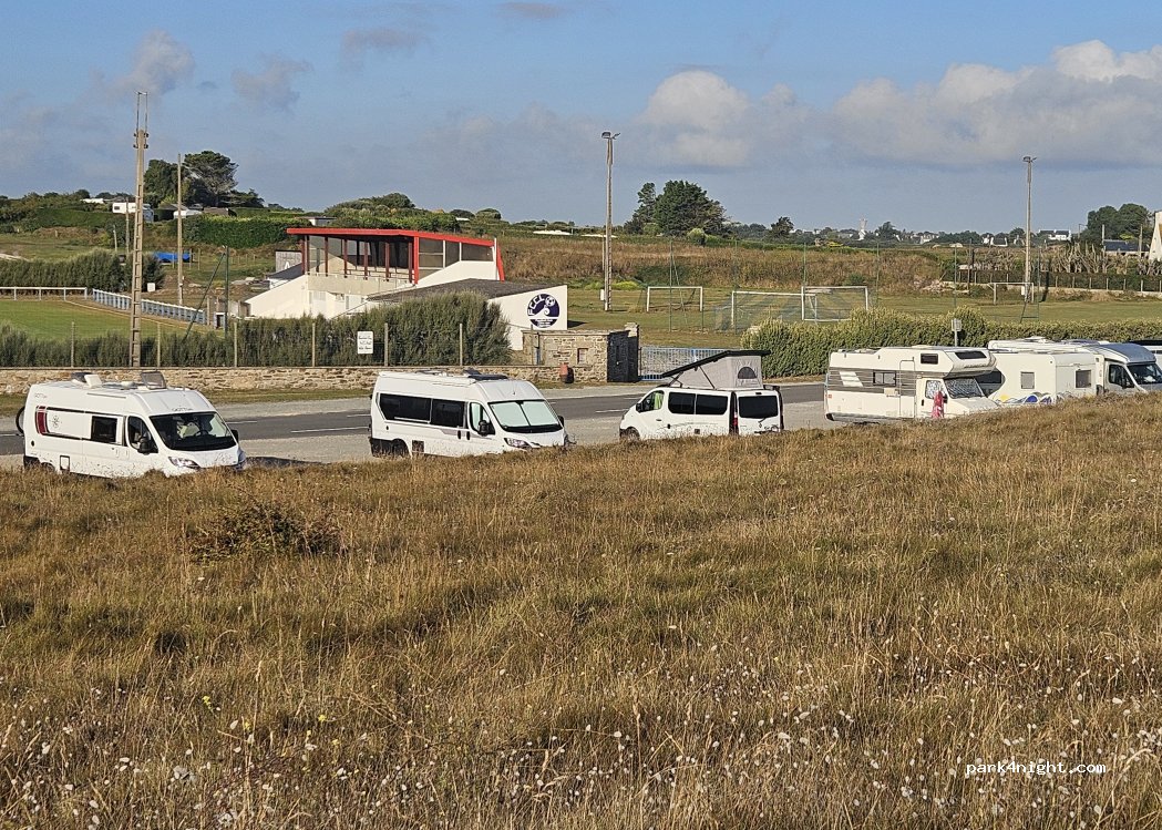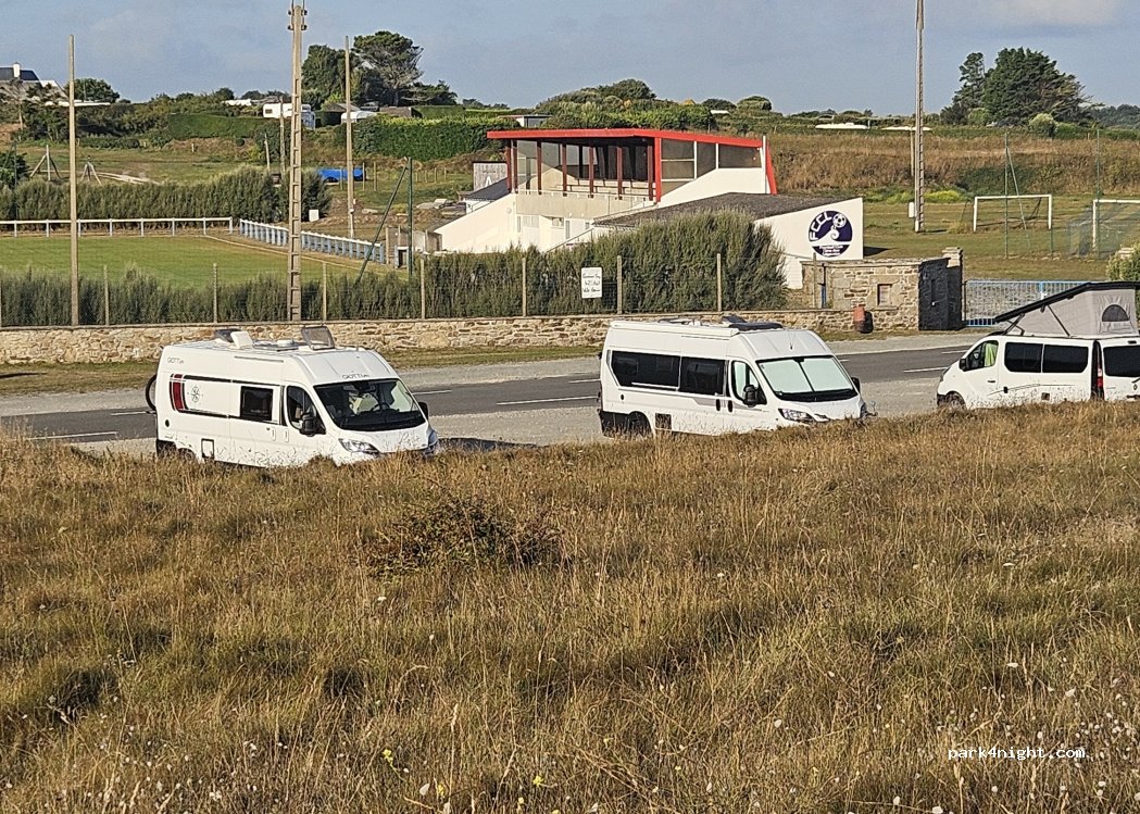 Grand parking plat, calme la nuit. pas de vue, mais une jolie grande plage accessible derrière la dune. un petit robinet d'eau est disponible l'autre côté de la route sur le muret du stade à côté de la bouche d'incendie.