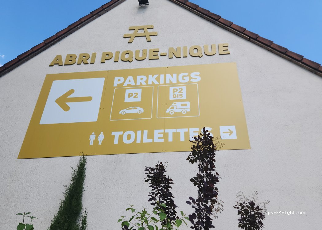 Merci au parc de lettre à dispo ce parking gratuitement. Cote gauche en légère pente. Toilette et aire de pique nique a disposition ( non utilisé)