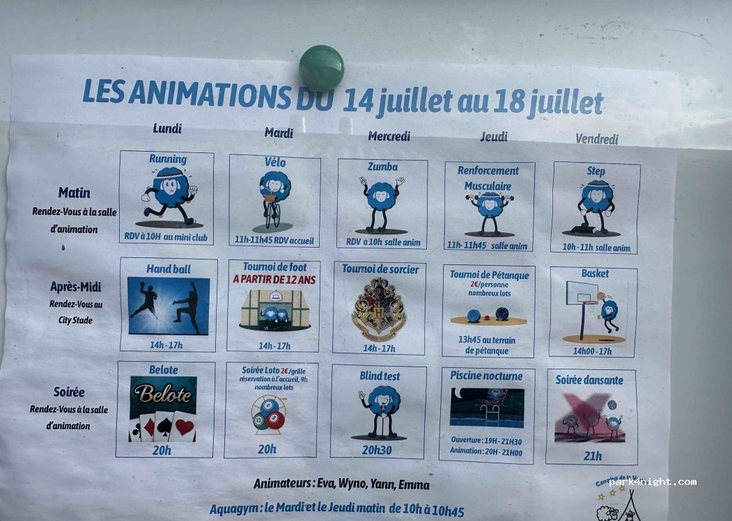 Camping sur un grand terrain vague pas toujours plat, avec les numéros des places écrits à la bombe sur l’herbe, manque de structuration mais une très belle piscine (vu le monde pas la plus claire que l’on ait eu) un snack avec peu de places dehors … animations bof … en revanche pas mal d’habitués … nous avons été cependant très bien reçu ! Il y a une supérette sur place et la plage accolée.