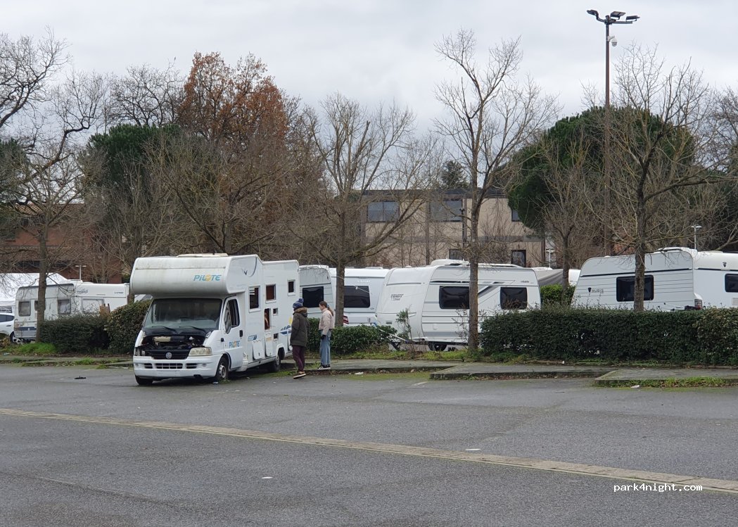 Very quiet parking day and night. There is a gate at the entrance. You must bring your campervan to the door and press the intercom for a few seconds, the door will open. There is no filling or emptying service. Shade in some parts. All paved. The fastest way to get to the center (about 40 minutes), take bus line 12 just opposite (cross the road) to the Roseraie stop then take metro A towards Basso Cambo, Jean Jaurès stop. You buy a ticket at the start valid for 1 hour.