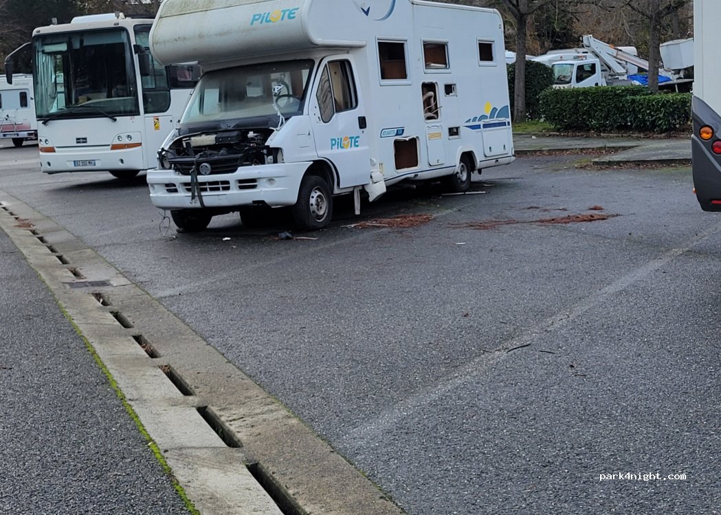 Zeer rustige parkeerplaats, dag en nacht. Er is een slagboom bij de ingang. U moet uw camper tot aan de deur brengen en een paar seconden op de intercom drukken, waarna de deur opengaat. Er is geen vul- of ledigingsservice. Op sommige plaatsen is er schaduw. Alles is verhard. De snelste manier om het centrum te bereiken (ongeveer 40 minuten) is door buslijn 12 te nemen, recht tegenover (de weg oversteken) tot halte Roseraie. Neem vervolgens metro A richting Basso Cambo, halte Jean Jaurès. U koopt aan het begin een kaartje dat 1 uur geldig is.