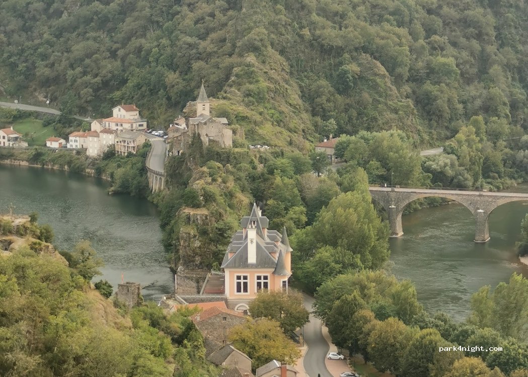 Sehr schöner und Nachts ruhiger Ort. Direkt auf dem Berg beim alten Kloster. Öffentliche, kostenlose Toilette seitlich am Kloster. Am Aussichtspunkt hat man einen wunderschönen Blick auf die Täler des Flusses Tarn. Über den kleinen, felsigen Fußweg hinunter ins Dorf gelangt man zum Café de la presqu'ile, wo man lokalen Wein und einfache Speisen bekommt.