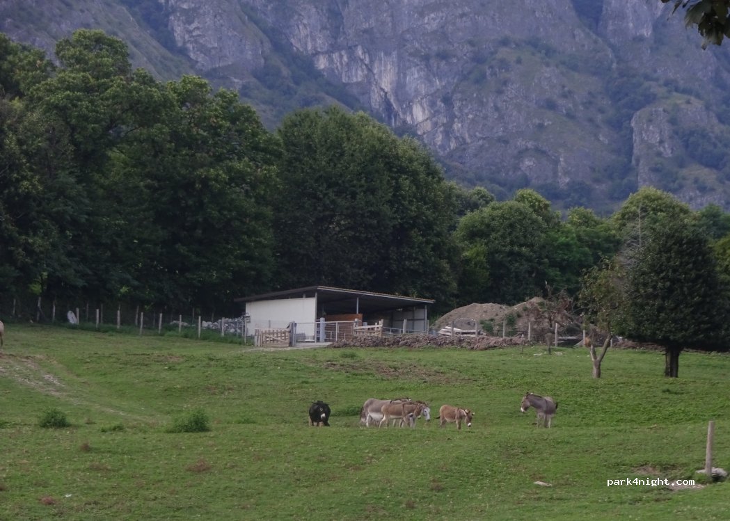 Endroit magnifique avec des animaux de la ferme (chevaux, vaches, ânes et anons)et la montagne juste derrière. Les enfants ont adoré. Départ de ballade pour avoir une vue à couper le souffle sur le lac de Côme. Route assez fréquentée dès le matin. Le plus, eau potable à dispo et tables de pique nique ! Attention grand van !