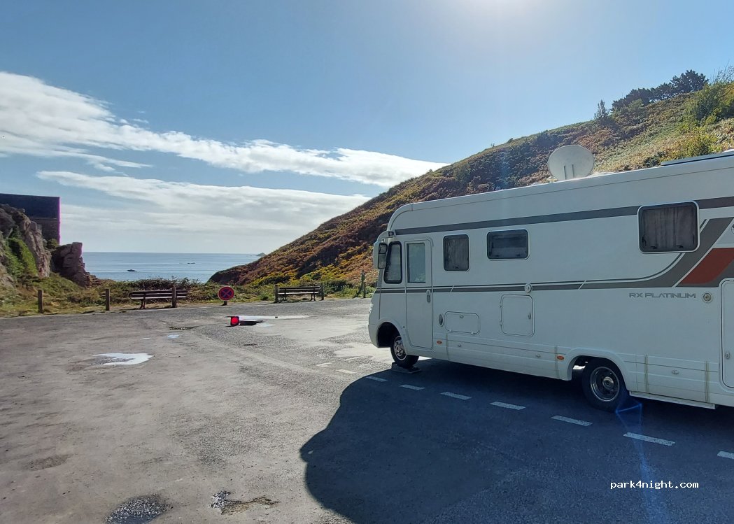 Un autre parking non bitumé se trouve au-dessus de ce parking. Prendre la petite route à droite au lieu de descendre par le circuit des falaises. Stèle plus belle vue sur la côte. Très tranquille. Pas mal de places mais en hauteur par rapport à la côte. Départ de randonnées. Pas de service