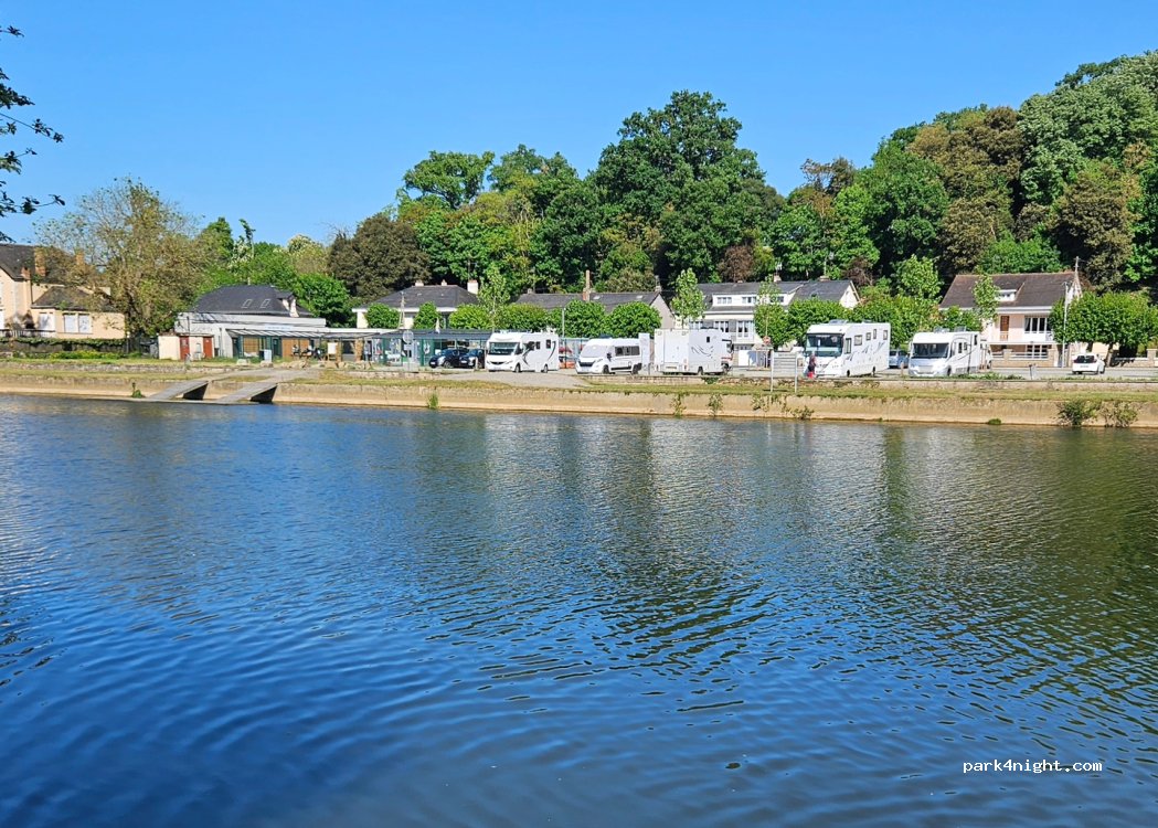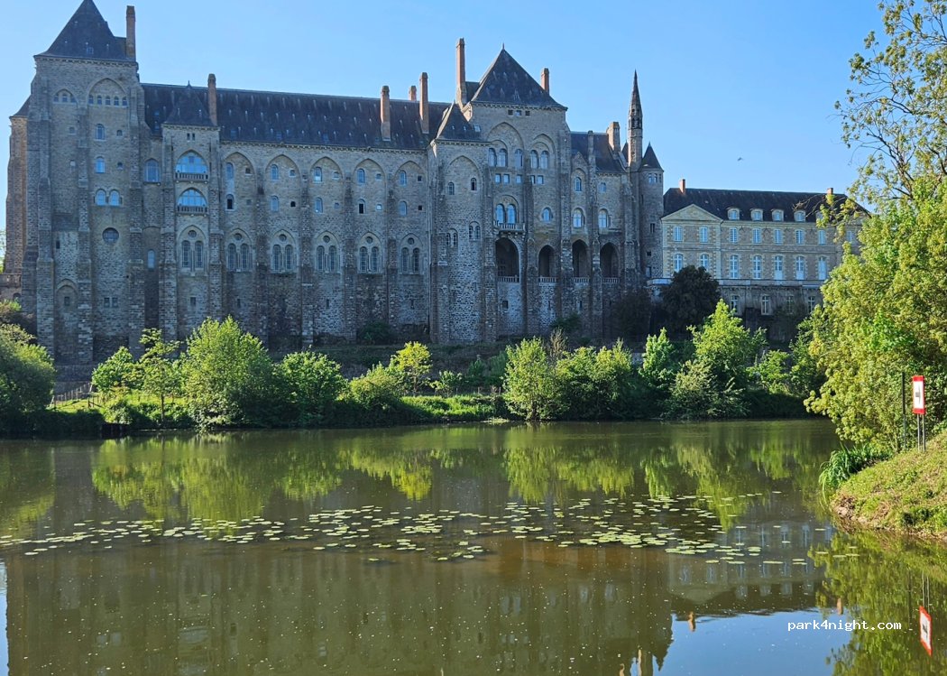 Very nice car park on the banks of the Sarthe, quiet at night, play area for children near the town center, near the swimming pool.