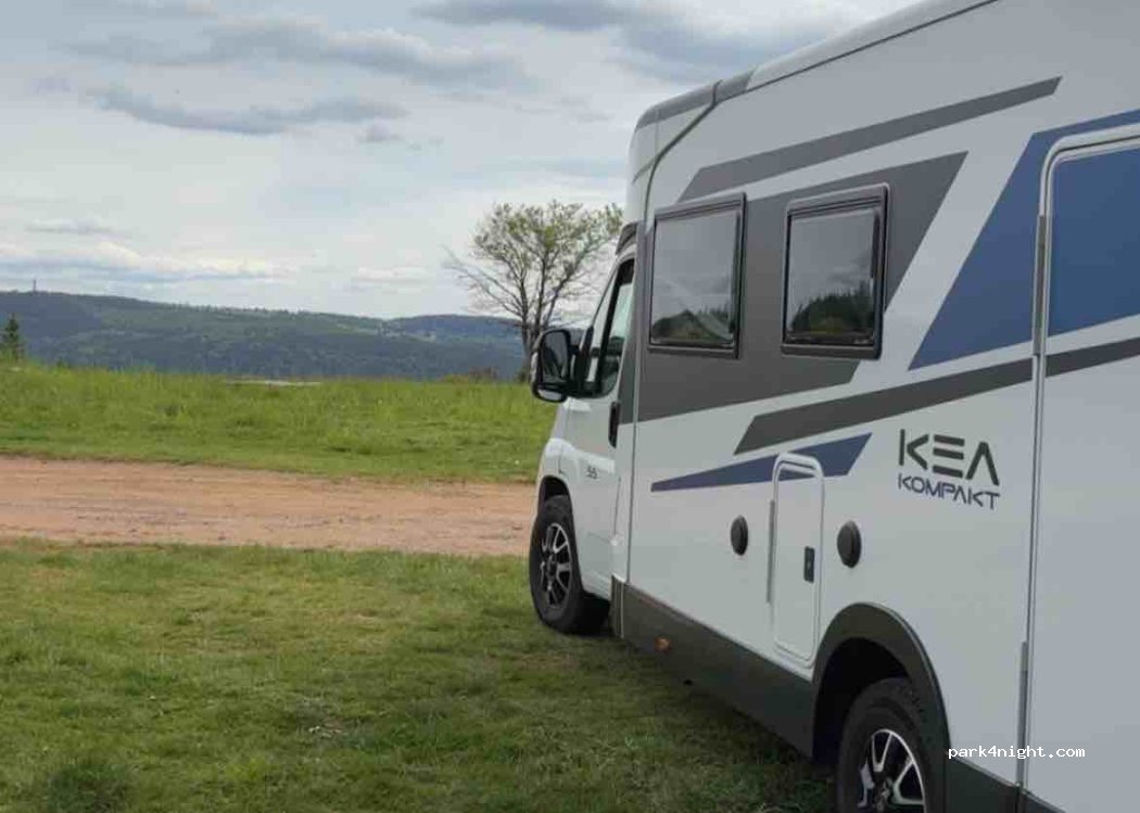 Offroad lay-by with plenty of grass next to hiking routes and forest area. Good views of surrounding forests and hills.