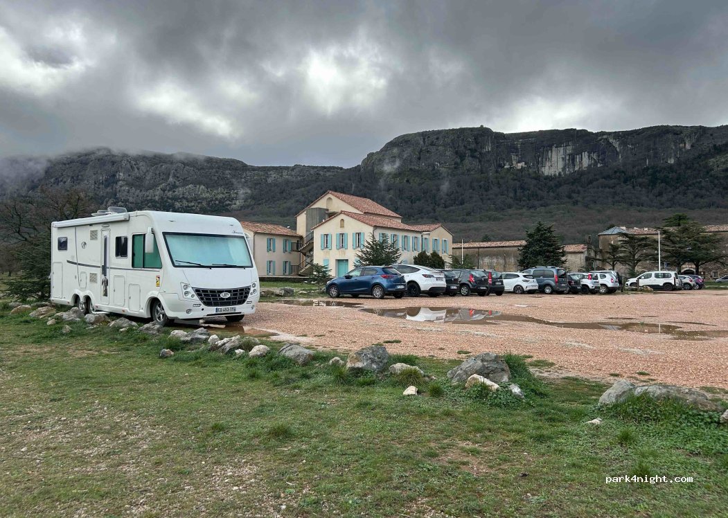 Grand parking bien à plat, j'y suis resté une semaine! Très calme et tranquille. Brasserie et office de tourisme avec Wifi gratuit, départs de randos! Petit point négatif en cette période (Octobre) il fait beaucoup plus froid et la météo est moins clémente que de l'autre côté du massif de la Ste Beaume.