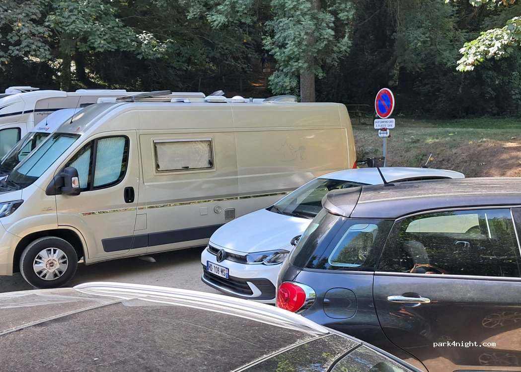 parking en terre battue avec beaucoup de passage jusqu'à 23h calme la nuit mais en pente ça depanne bien quand même