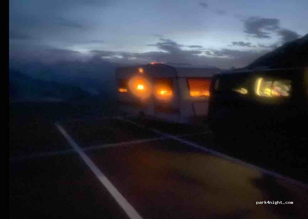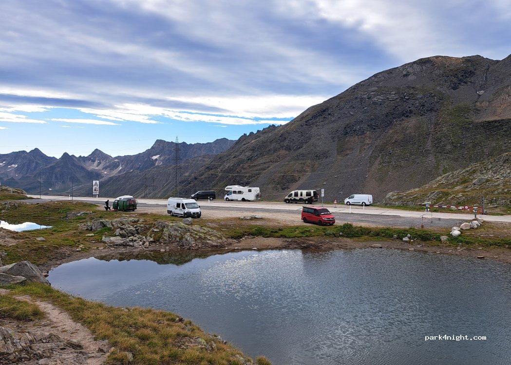 Mehrere Plätze neben der Strasse auf der Passhöhe. Nachts ruhig, fast kein Verkehr. Restaurant und Kiosk in der Nähe. Tolle Aussicht und grosse Chancen, Steinböcke zu sehen.