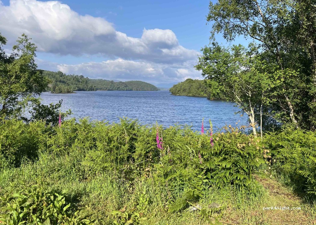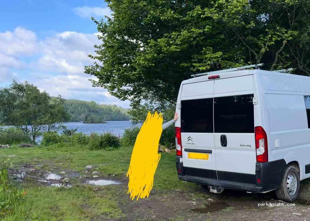 Good place for the night. Not too much road noise. Little rocky beach with a good view of the loch.