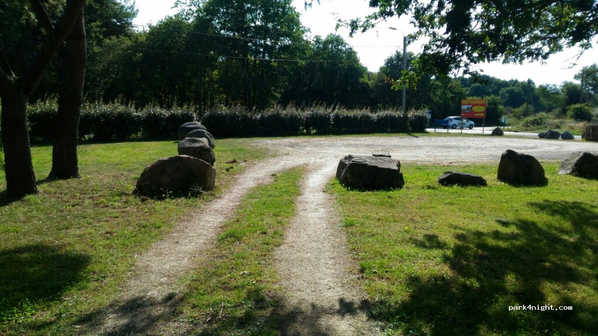 Un parking pour une dizaine de véhicules. 7 tables de pique-nique très espacées avec un menhir au centre. Un peu bruyant à cause de la route à proximité.