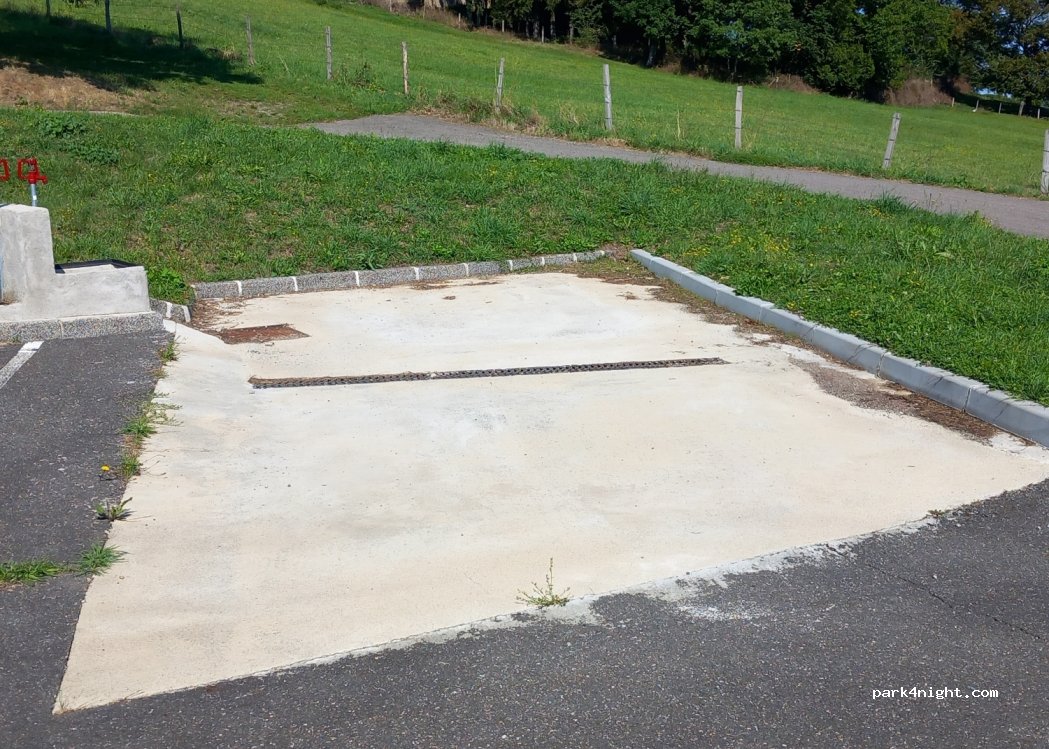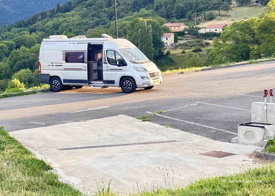 C'est le parking de la salle des fêtes, goudron et légèrement en pente. Nuitée un peu bruyante ce qui a pour effet de faire aboyer les chiens... Jolie vue, joli village et bonne fourme à la fromagerie. Malheureusement le musée de la fourme était fermé horaires restreints hors juillet août
