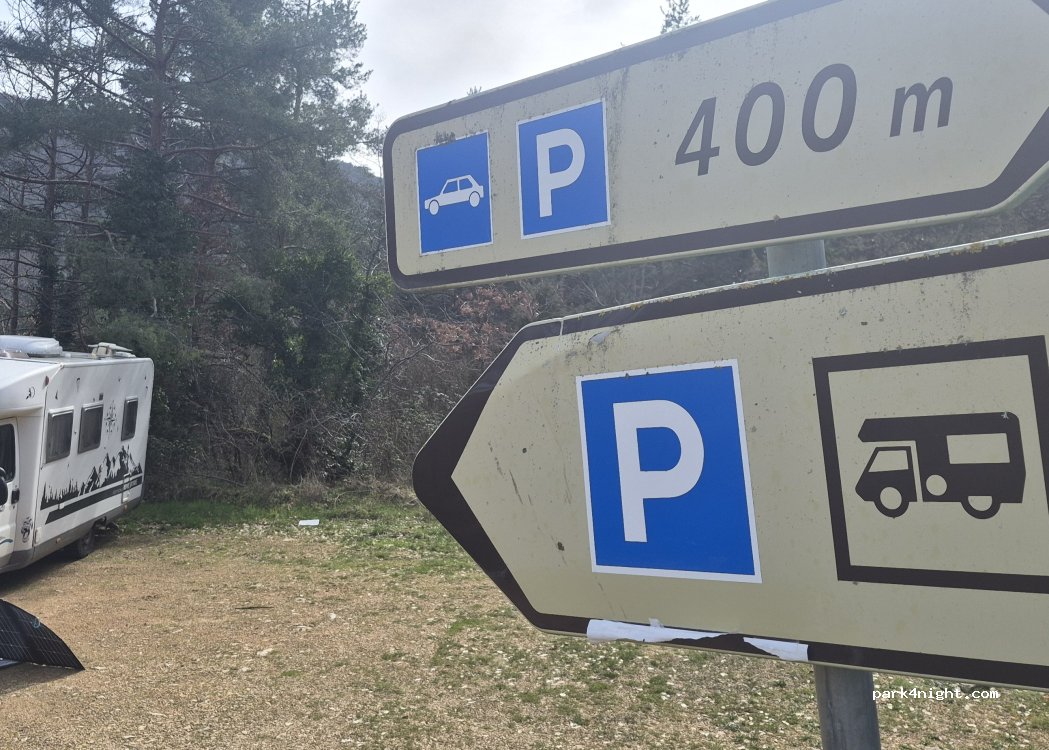Le parking est plutôt petit.La route est étroite et elle monte dur,mais je suis passé avec mon camping-car Jumper de 6,50 m de long. Attention, ça patine pour rentrer dans le parking, il faut bien prendre son élan pour rentrer, sinon il faudra faire une marche arrière et reprendre de l’élan.S'il y a déjà un CC, ne tentez pas de rentrer, vous allez vous coincer,il y a la place que pour 1 CC.