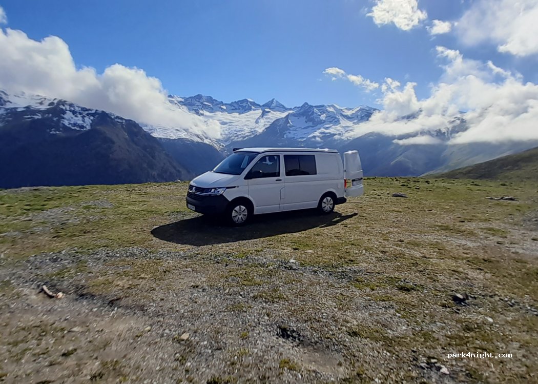 exceptionnel, tranquilite totale et vue splendide, le parking de la station est plein de camions pour des travaux mais ici ce ne sont que les clarines et le silence.. attention pour les CC barre à 2.25 mètres.