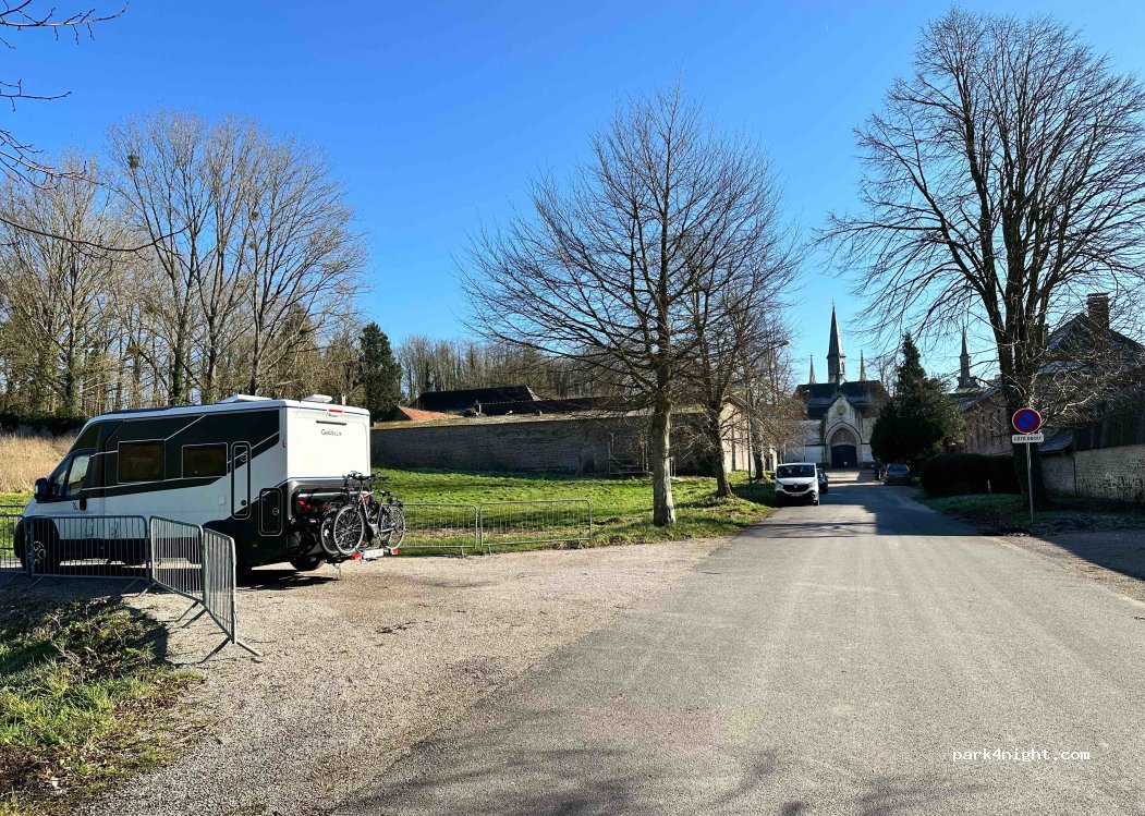 Path to the Chartreuse de Neuville. Road lined with trees where you can put a camper on some places (small motorhome and vans will have more ease, I parked with a 7m). Ideal for a snack break with chartreuse visitable, as well as gardens. Not tested at night but no ban displayed.