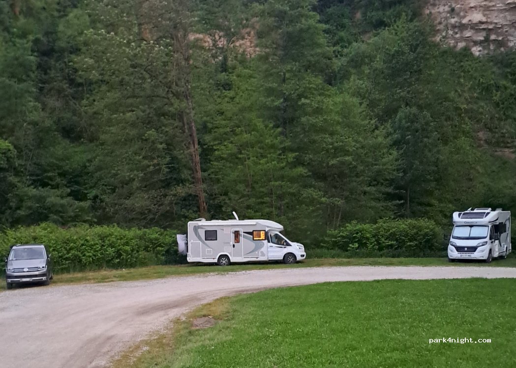 Parking muy agradable, al lado de un pequeño arrollo (un poco mas arriba hay una fosa del pueblo que da directamente al rio, mejor no bañarse, a ratos huele a toallita). Hay mucha sombra debajo de los arboles, el pueblo es caro y siempre dinero de por medio, vale la pena ver l'abbaye y ya si escuchas el organo subes al cielo. gracias por este sitio!