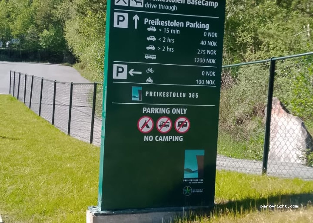 Der Parkplatz verbietet das Campieren, nicht aber das Stehen über Nacht (solange nichts raus gestellt wird). Die Tarife gelten jeweils bis Mitternacht, egal wann man auf den Platz fährt. Wir sind mit unserem 7.5m Wohnmobil um 4.30 Uhr auf den Parkplatz gefahren, genug Platz und nach der Wanderung rausgefahren für NOK 250.